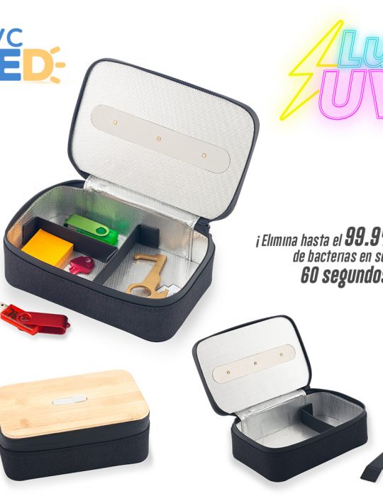 Organizador en poliéster con cierre de cremallera y tapa en bamboo, luz interna UVC LED de esterilización e interior aluminizado para ampliar el efecto de esterilización. El proceso de esterilización del producto funciona estando siempre conectado, con cable micro USB para conectar a un puerto USB. Ciclo rápido de 60 segundos o completo de 180 segundos. Cierre de seguridad con slider magnético. Capacidad interna para un Smartphone de hasta 6” o varios objetos pequeños que se pueden organizar con las bandas internas.